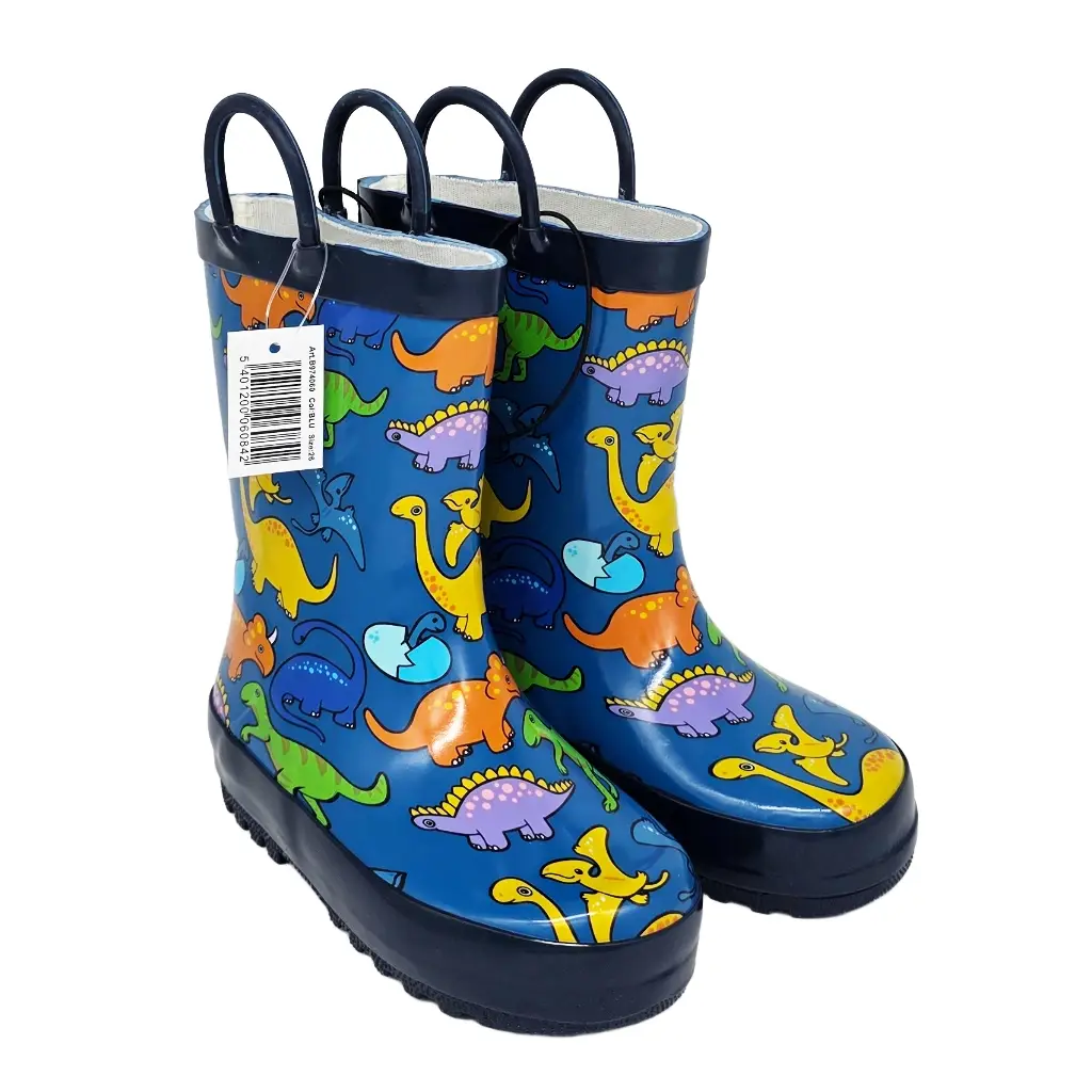 Die Dino-Regenstiefel für Kinder sind mit allerlei lustigen Dinos bedruckt – vom langen Hals bis zum gepanzerten Rücken. Manche grinsen, manche schlafen noch in ihrem Ei – auf diesen Stiefeln gibt es viel zu entdecken! Die fröhlichen Farben auf dem dunkelblauen Hintergrund machen schon beim Anziehen gute Laune. 💙
