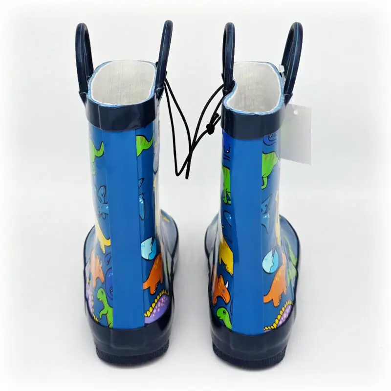 Dank der praktischen Schlaufen lassen sich die Dino-Regenstiefel für Kinder ganz leicht selbst anziehen – das schafft sogar der kleinste Dino-Fan ganz alleine. Die rutschfeste Sohle sorgt für sicheren Halt auf nassem Boden, während das weiche Innenfutter angenehm warm hält.
