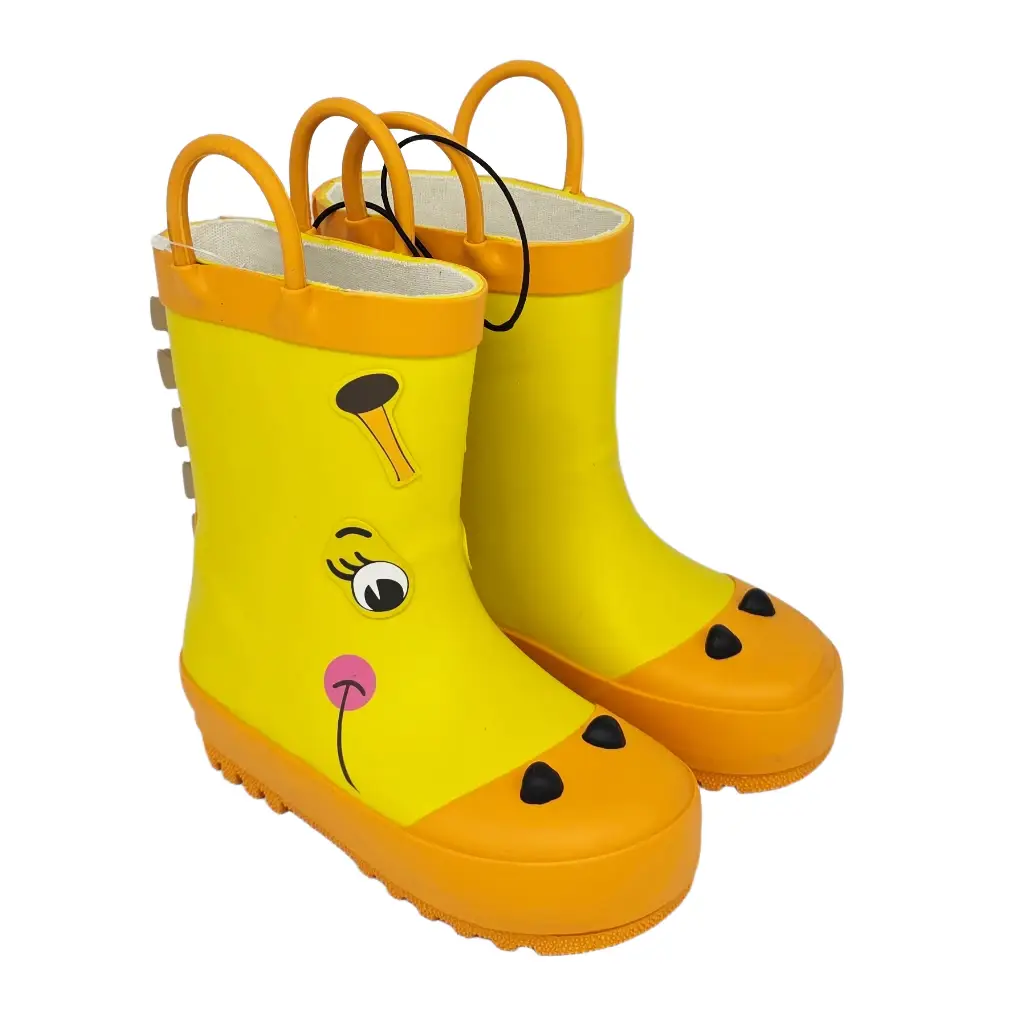 Kinder‑Gummistiefel im Giraffen‑Design mit grossen Schlaufen für leichtes Anziehen. Wasserfestes Aussenmaterial, weiches Baumwollfutter und griffige Profilsohle. Verstärkte Zehenpartie und pflegeleichte Oberfläche für Spielplatz und Kindergarten.