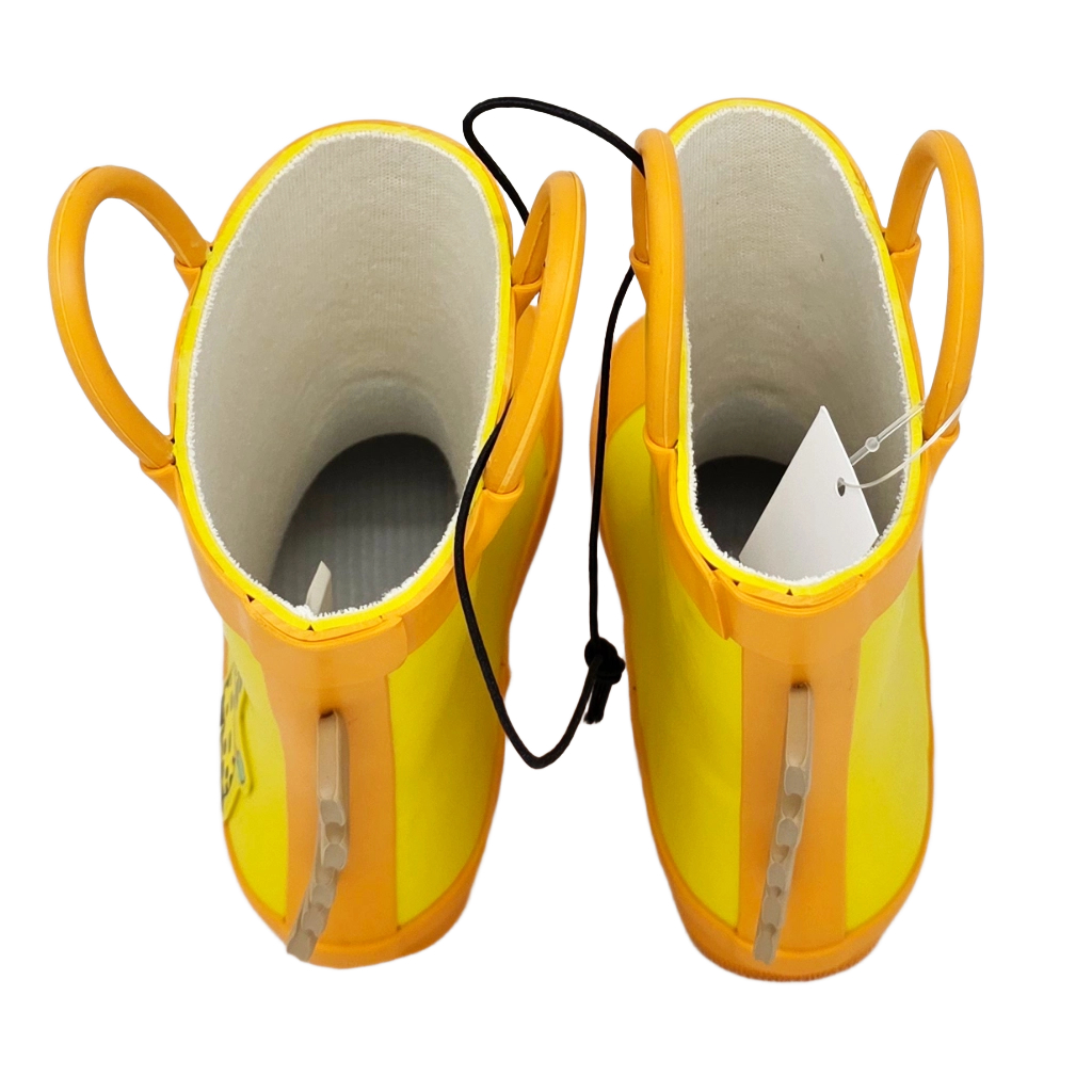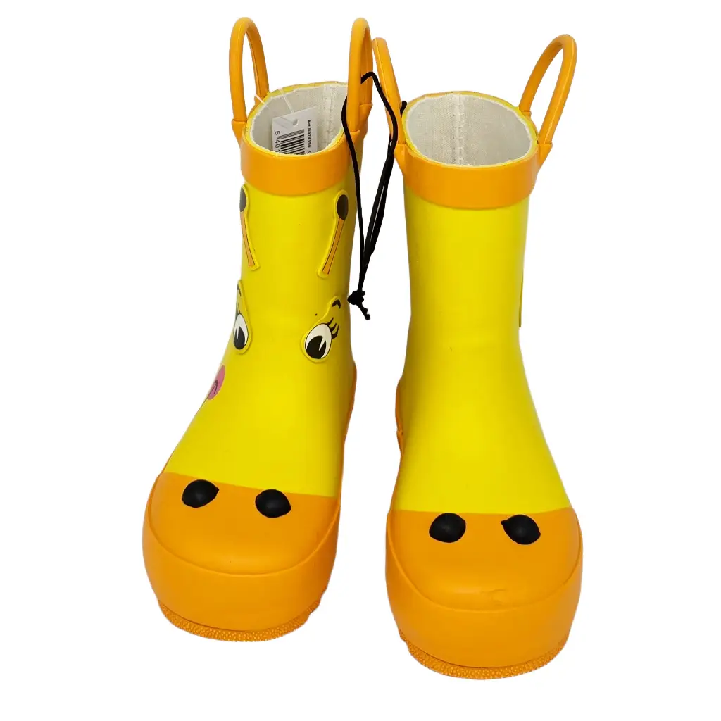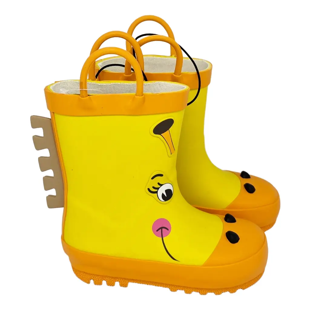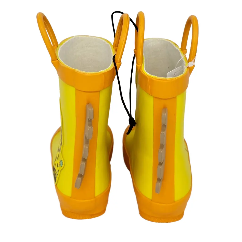 Unsere Kinder Gummistiefel Giraffe bringen Sonne in jeden Regentag. Das leuchtende Gelb, die fröhlichen Augen und die schwarzen Nüstern auf der Zehenkappe machen jeden Schritt zur Mini-Safari. Dank grosser Anziehhilfen schlüpfen kleine Entdecker selbstständig hinein, und die profilierte Sohle sorgt für sicheren Halt beim Pfützenhüpfen, auf nassem Rasen oder auf dem Kita-Weg. Hinten ziert eine helle, dekorative Giraffenmähne den Schaft. 🦒☔