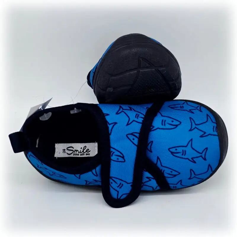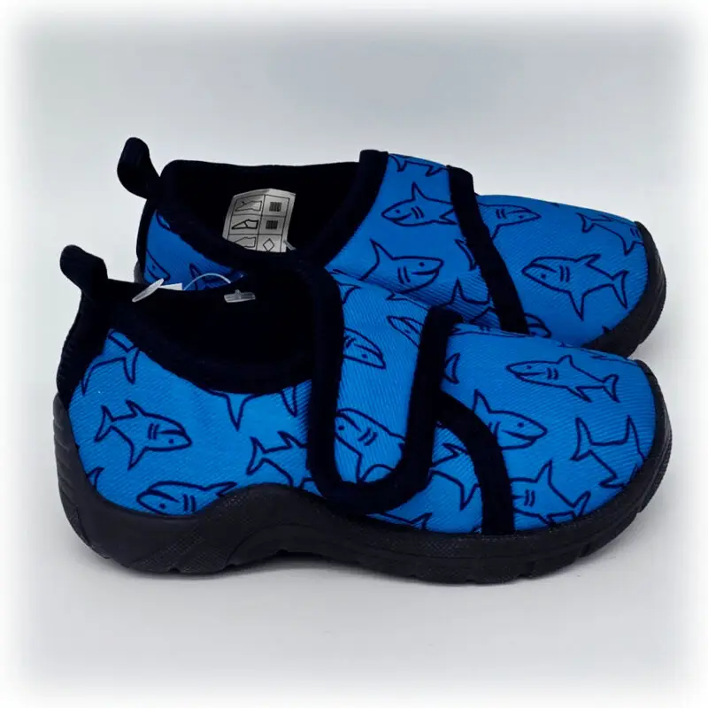 Mit den Hai-Alarm Flossenflitzern – blauen Kinderhausschuhen mit Hai-Motiv – wird jeder Schritt zum Unterwasserabenteuer. 🦈 Bequem, rutschfest und mit kinderleichtem Klettverschluss sind sie perfekt für kleine Entdeckerfüsse.