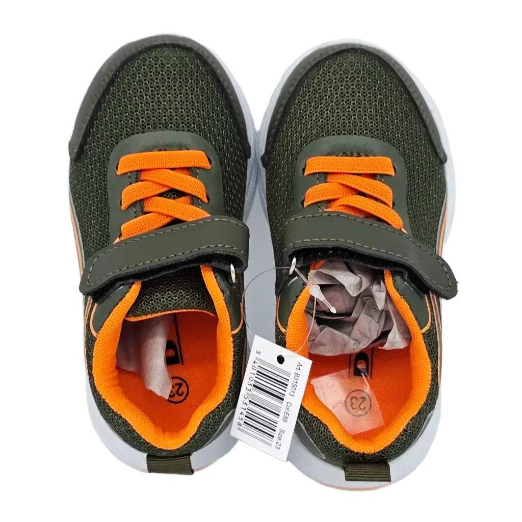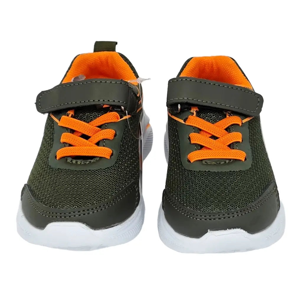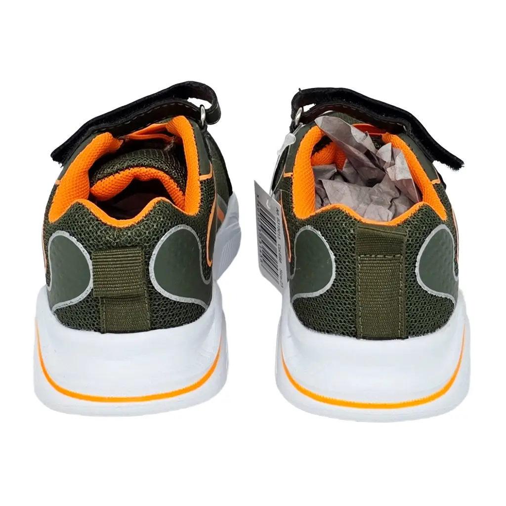 Leichter Kindersneaker mit Klettverschluss in Grün mit orangefarbenen Akzenten. Atmungsaktives Mesh innen, griffige EVA‑Sohle und reflektierende Details. Für Schule, Spielplatz und Freizeit.