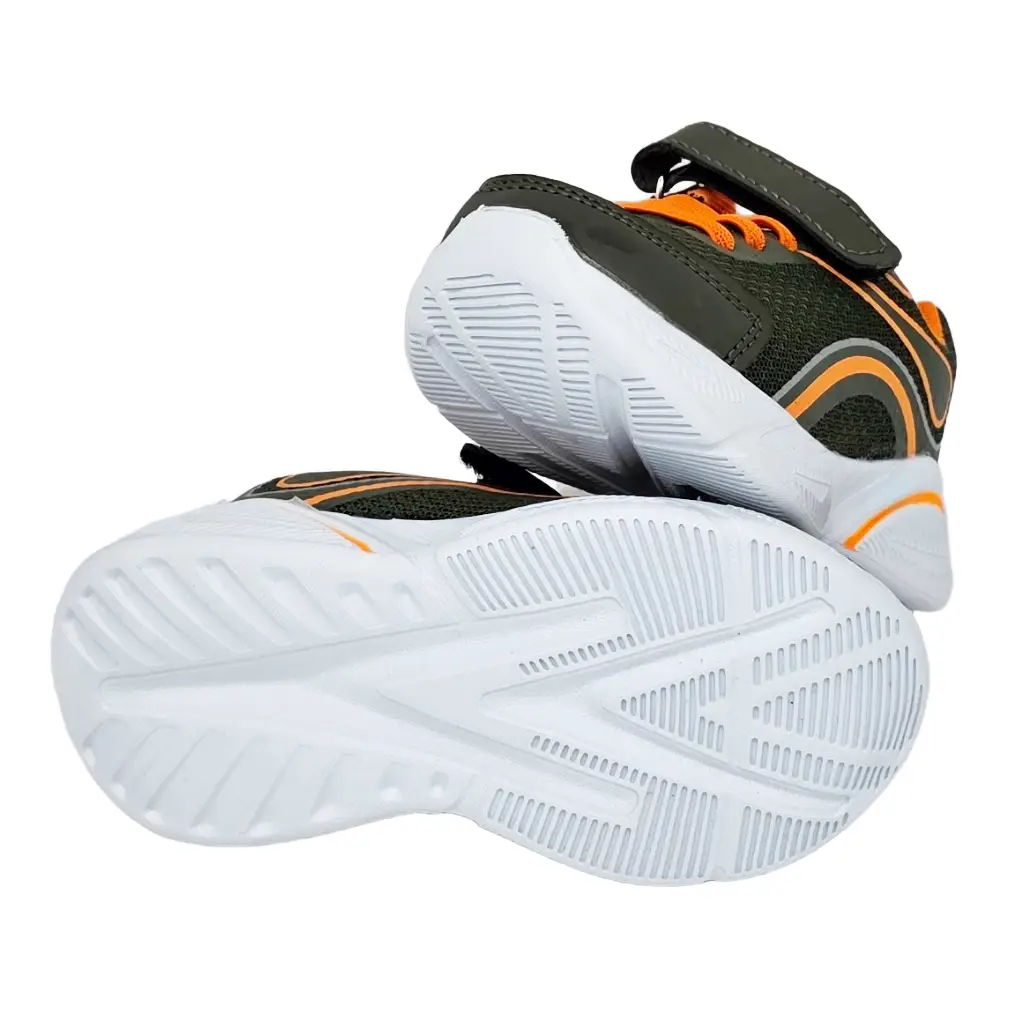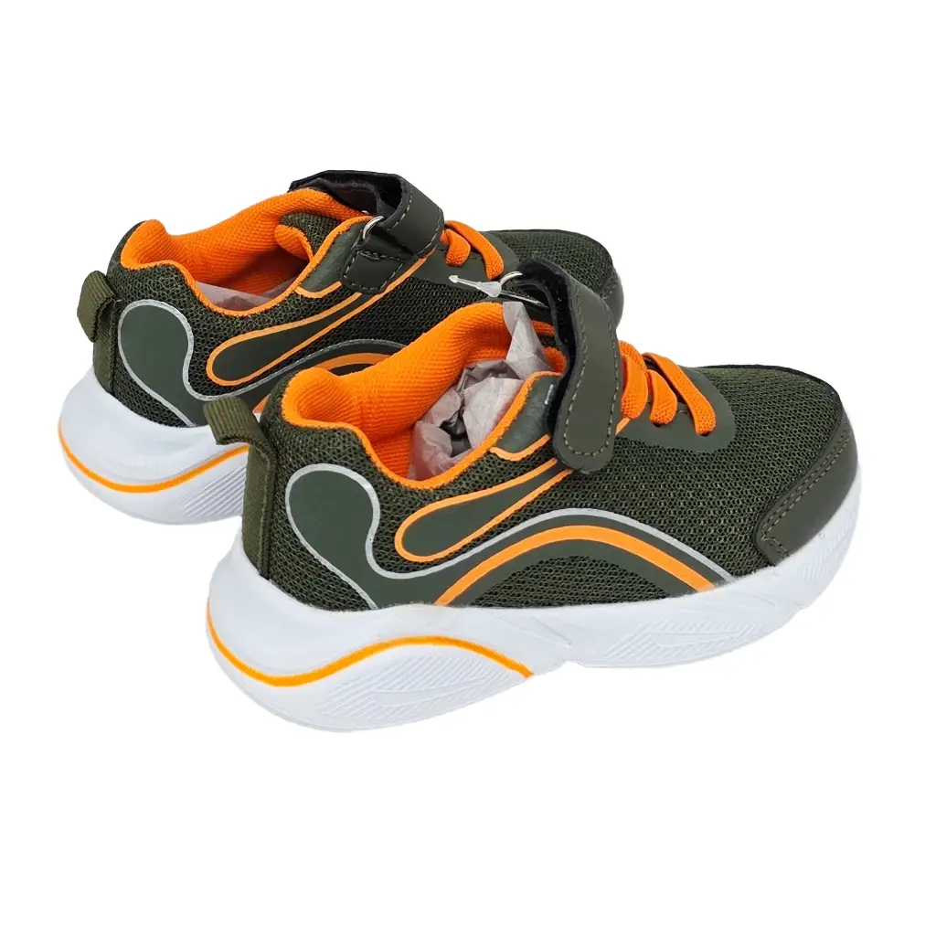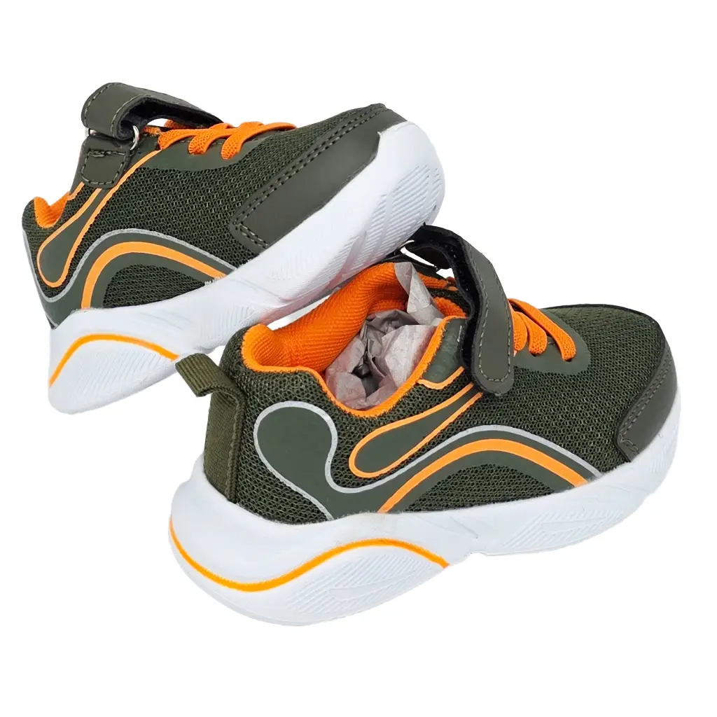 Leichter Kindersneaker mit Klettverschluss in Grün mit orangefarbenen Akzenten. Atmungsaktives Mesh innen, griffige EVA‑Sohle und reflektierende Details. Für Schule, Spielplatz und Freizeit.