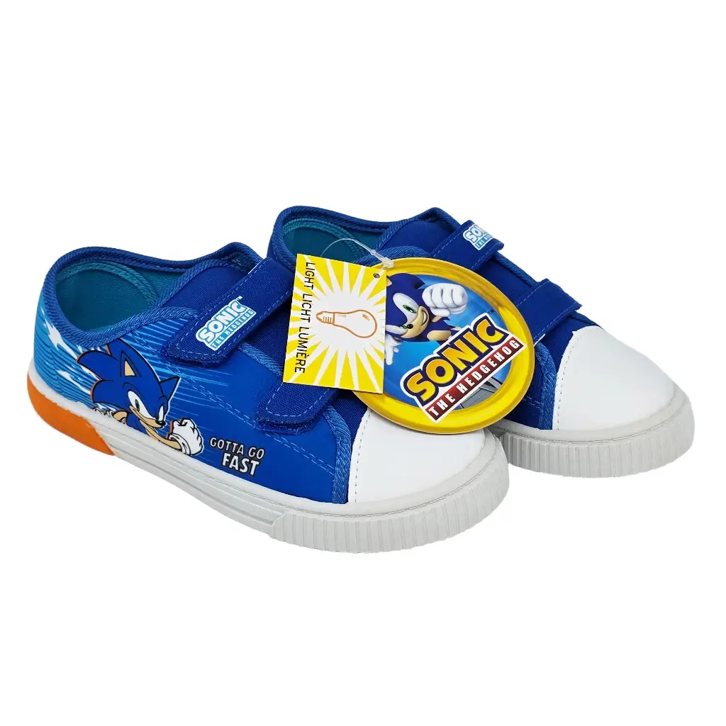 Offiziell lizenzierter SEGA Kinder-Sneaker von Leomil im Sonic-Design mit LEDs in der Sohle, die beim Gehen leuchten bzw. blinken. Zwei breite Klettverschlüsse erleichtern das eigenständige An- und Ausziehen; atmungsaktives Obermaterial in Canvas-Optik und flexible, rutschhemmende Laufsohle geben Halt beim Spielen.