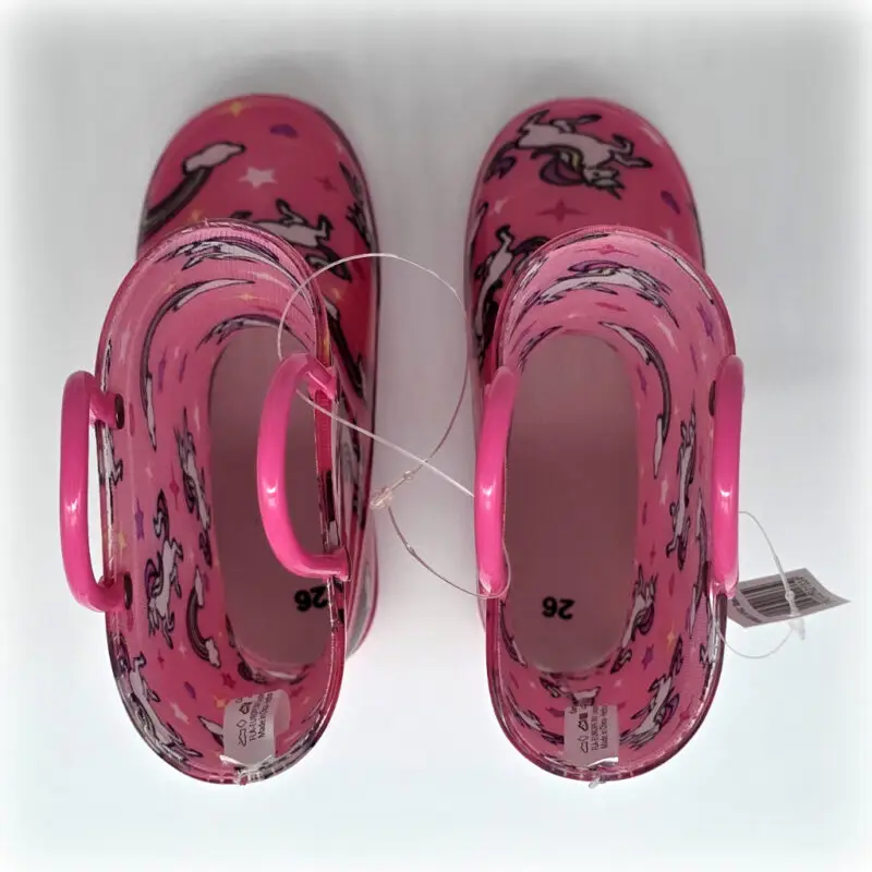 Diese fröhlich-pinken Einhorn-Gummistiefel für Kinder bringen Farbe in graue Regentage. Ob beim Pfützenspringen im Wald, auf dem Weg zum Kindergarten oder beim Spielen im Garten – mit diesen Regenstiefeln sind kleine Füsse immer trocken und gut gelaunt unterwegs.