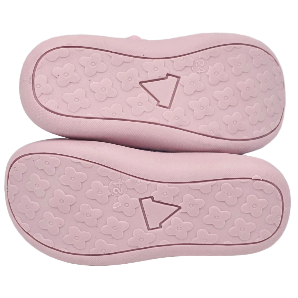 Die flexible Gummisohle in passend zartem Rosa bietet genau den richtigen Mix aus Stabilität und Bewegungsfreiheit – ideal für kleine Laufanfängerinnen. Das entzückende Blümchenprofil auf der Unterseite sorgt dafür, dass kleine Abenteurerinnen auf Fliesen, Parkett und Teppich sicher unterwegs sind – ohne Ausrutscher bei der nächsten Pirouette! Die gepolsterte Innensohle in hellem Grau schützt empfindliche Kinderfüsse und hält sie den ganzen Tag bequem. Leicht und biegsam genug, um natürliche Bewegungen zu unterstützen – perfekt für Füsse, die gerade die Welt entdecken.