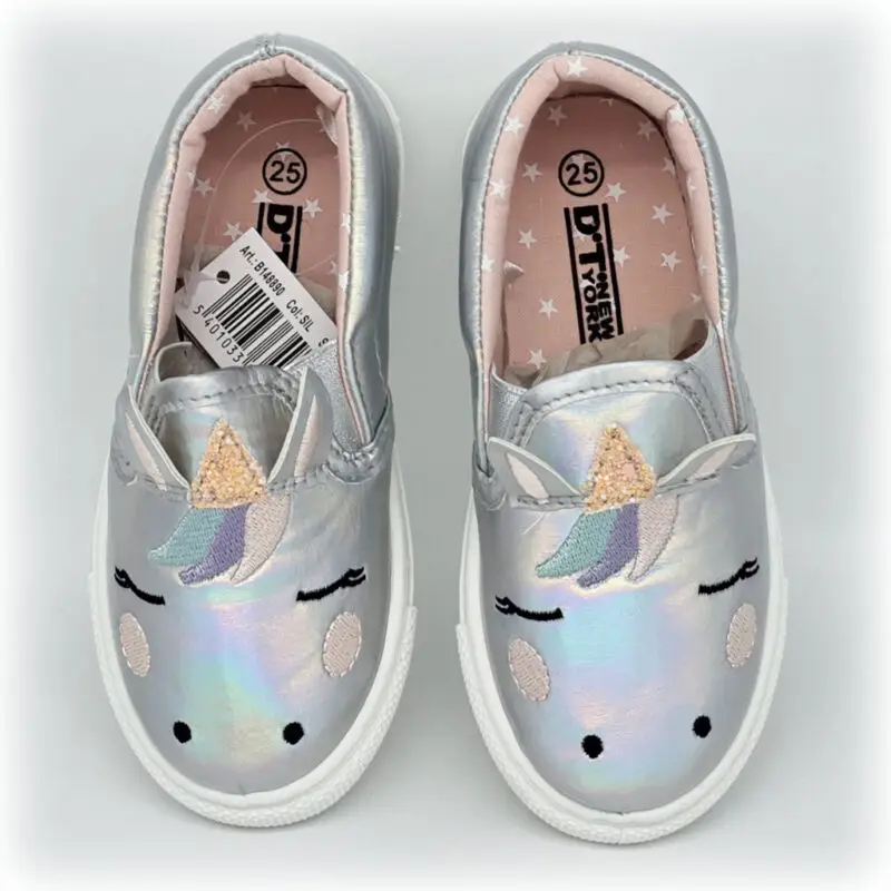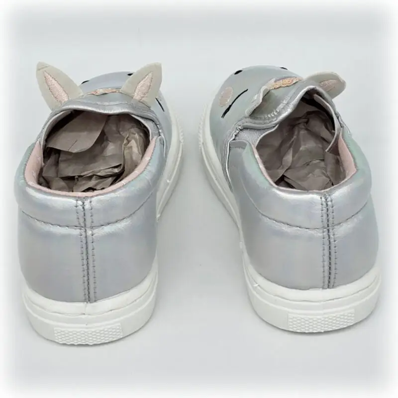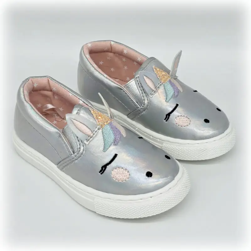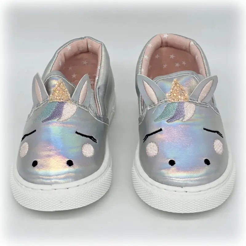 Schon beim ersten Schritt verzaubert der Glitzer-Einhorn Slipper mit seinem schimmernden Silber-Look. Auf dem Schuh strahlt ein freundliches Einhorn-Gesicht mit Wimpern, rosa Bäckchen und kleinen Öhrchen. Ob für den Kindergarten, einen Ausflug mit der Familie oder die nächste Einhorn-Party – mit diesen Kinderschuhen ist dein Kind immer bestens gekleidet.