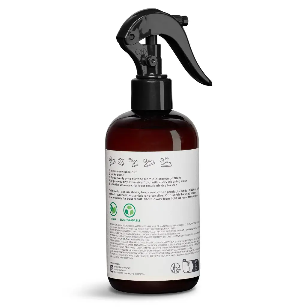 Imprägnierspray für Schuhe und Textilien – wasserbasiert, PFAS-frei und atmungsaktiv. Schützt Leder, Textil, Wildleder/Nubuk, Synthetik und Funktionsmaterialien vor Nässe und Schmutz. Anwendung: saubere Oberflächen aus ca. 30 cm gleichmässig einsprühen und 24 Stunden trocknen lassen. Flasche aus recyceltem Kunststoff.
