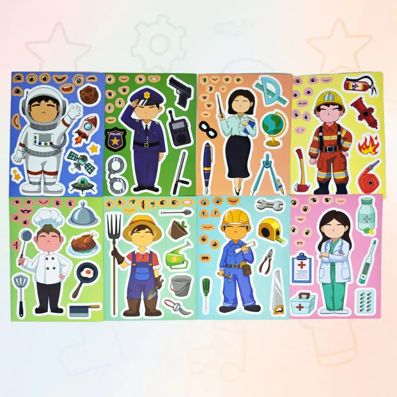 Jeder Stickerbogen stellt eine Figur mit typischer Berufskleidung und passenden Utensilien dar – vom Bauhelm bis zur Weltraumrakete ist alles dabei! Die Gesichter, Augen und Münder sind austauschbar – so entstehen individuelle Figuren mit Charakter. Ein lustiger Schnauz beim Koch? Kein Problem! Schielende Polizistin? Warum nicht!